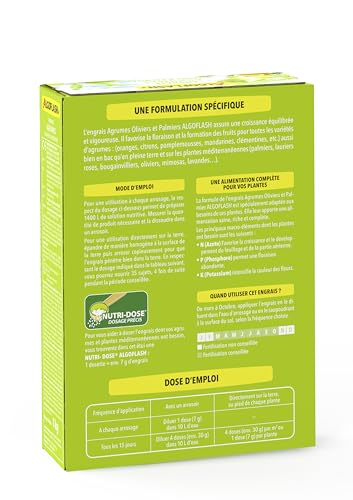 Engrais soluble en poudre pour stimuler une croissance vigoureuse et favoriser la floraison et la formation des fruits. Idéal pour toutes les variétés d’agrumes et plantes méditerranéennes (oliviers, palmiers, lauriers rose…) en pots ou pleine terre – Facile à utiliser et doser grâce à la dosette Nutri-Dose incluse et aux doses d’emploi indiquées au dos du produit, Jusqu’à 1400 L. S’utilise directement en épandage ou dilué en arrosage, Période de fertilisation recommandée : de mars à octobre – Pratique, Action longue durée jusqu’à 4 mois en 1 application, Longue conservation du produit grâce à la fermeture ZIP du sachet – Sa formule complète leur apporte une alimentation saine, riche et complète. Composition : NPK 14.7.17 avec oligo-éléments. ENGRAIS CE – Contenu : 1 x Algoflash Engrais Longue Durée pour Agrumes, Olivers, Palmiers, 1 kg, MED1R