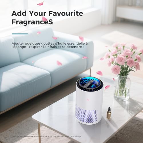 Profitez d’Un Air Parfumé : Il est équipé d’un tampon aromatique situé sous la sortie d’air qui vous permet d’ajouter 4 à 5 gouttes de votre huile essentielle préférée (non incluse). Lorsque le purificateur fait circuler l’air frais, le parfum se répand dans toute la pièce, créant un environnement agréable et sain pour vous et votre famille.