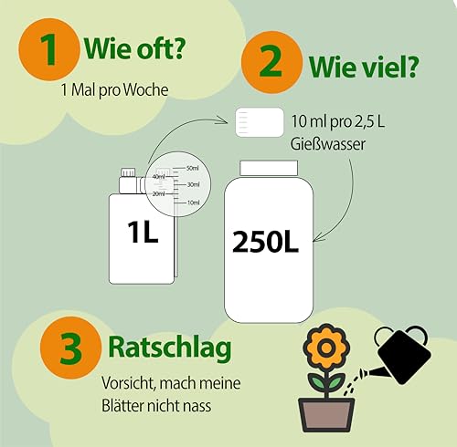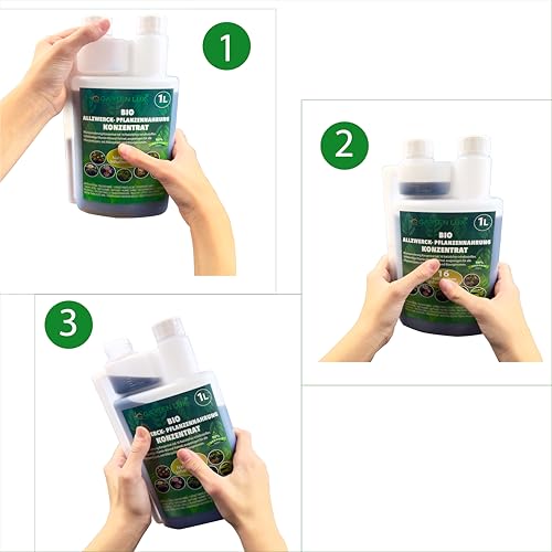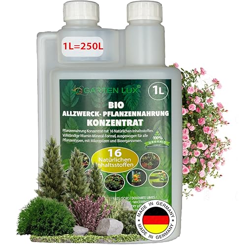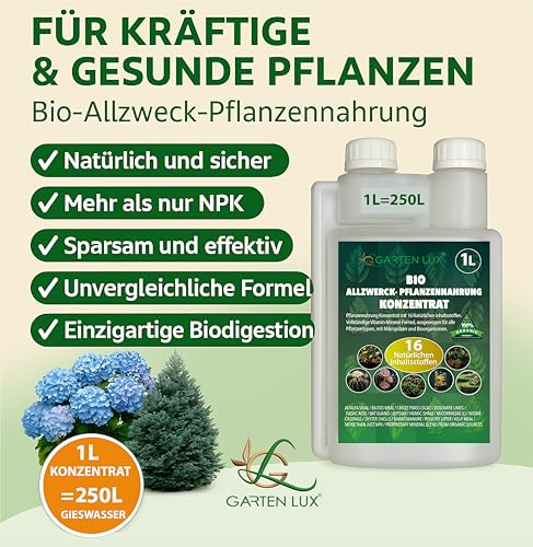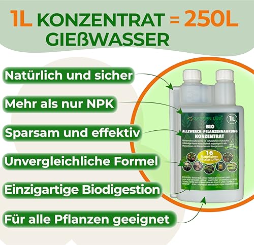 Spécification: BIO Engrais liquide concentré pour plantes de jardin et d’intérieur, Engrais universel avec 16 composants naturels, 1L de concentré donne 250L d’eau d’arrosage