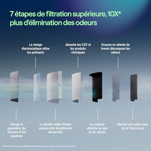 FILTRATION HEPASILENT À 7 ÉTAPES La double filtration capture 99,97 %** des particules en suspension jusqu’à 0,1 micron — y compris la fumée, la poussière et les allergènes — grâce à une technologie mécanique et électrostatique. Le flux d’air Surround Boost et le filtre OdorFence optimisent la purification de l’air dans toute la pièce, tout en réduisant le bruit et la consommation d’énergie.