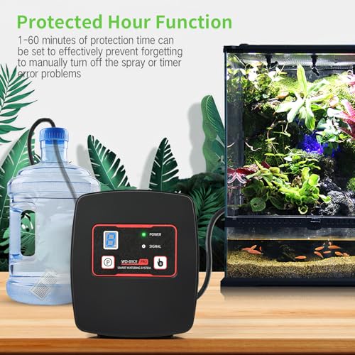 【3】Notre humidificateur pour reptiles a une nouvelle fonction de protection, vous pouvez régler le temps de protection de 1 à 60 minutes, après avoir activé cette fonction, peu importe la minuterie ou les heures de travail manuel au-delà du temps de protection, la pompe à eau s’arrêtera automatiquement, évitant ainsi d’oublier d’éteindre le spray ou le problème d’erreur de synchronisation.
