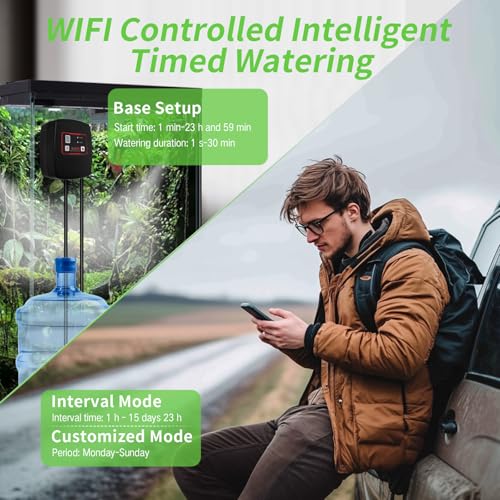 【1】Notre humidificateur pour reptiles est disponible avec une minuterie de cycle et des modes personnalisés. En outre, il dispose d’une fonction de contrôle à distance WIFI, vous pouvez régler l’heure et l’intervalle de chaque pulvérisation via APP pour fournir une humidité suffisante aux reptiles et aux plantes, afin que vous puissiez travailler et sortir sans inquiétude.