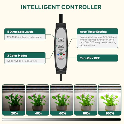 🌺【3 modes d’éclairage et 5 choices de gradation】La lumière de croissance pour plantes dispose de 3 modes d’éclairage (lumière blanche, lumière blanche + rouge et lumière mixte), 5 choices de gradation, réglez la luminosité dans une plage de 20% -100% et adaptez-la de manière versatile aux différents besoins des plantes en matière d’intensité lumineuse.