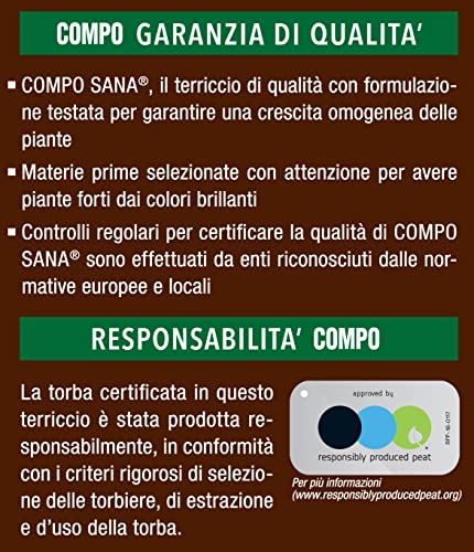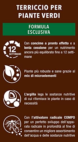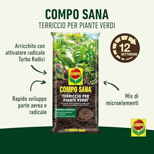 Terreau pour cultiver des plantes vertes ornementales (par ex. Philodendron, ficus, croton, dracaena, dieffenbachia, palmiers, etc.), tourbe de qualité – avec engrais à effet rapide et à libération lente pour une nutrition équilibrée jusqu’à 12 semaines, favorise la croissance de plantes plus saines et robustes avec des feuilles aux couleurs intenses – Avec activateur racinaire COMPO pour des racines fortes qui permettent une absorption optimale de l’eau et des nutriments, ajout d’argile pour améliorer la Rétention d’eau – Mode d’emploi : 1) Remplir le pot avec du terreau ; 2) Nettoyer les racines et placer la plante. 3) Ajouter du terreau dans les parties vides jusqu’à 1 cm du bord. 4) Bien niveler et arroser – Contenu : 1 sac de COMPO SANA Terreau pour plantes vertes, Poids : 10 L, Art. N° 1143102005
