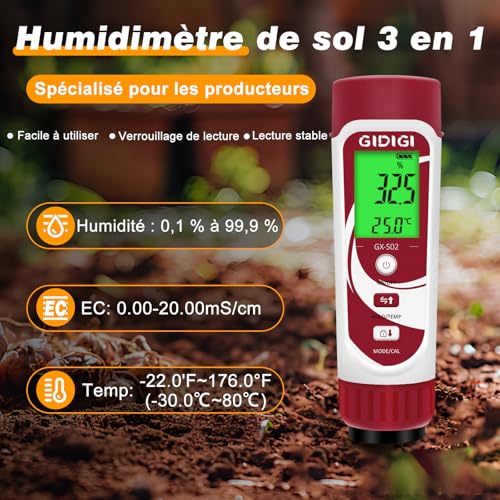 Spécification: Compteur d’humidité du sol numérique, compteur de conductivité électrique du sol 3 en 1, hygromètre et compteur d’humidité du sol pour plantes domestiques, jardiniers, composteurs, pépinières