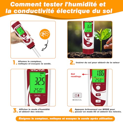 Hygromètre scientifique et sensible} Le testeur d’humidité du sol GiDIGI utilise la technologie FDR pour détecter l’humidité du sol, capable de détecter avec précision les variations d’humidité du sol des plantes. La teneur en humidité du sol sec est de 0,0 %, celle liquide est de 100 % et la teneur en humidité du sol adaptée à la plupart des plantes est comprise entre 21 % et 40 %.