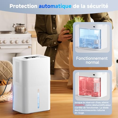 【Arrêt Automatique & Grand Réservoir】Équipé d’un réservoir de 2700 ml avec voyant de niveau et poignée, ce déshumidificateur d’air anti-moisissure s’arrête automatiquement quand le réservoir est plein (2500 ml) et signale par un témoin lumineux rouge. Sécurisé même en absence
