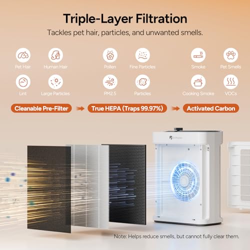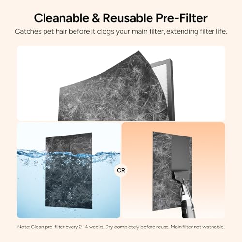 【Préfiltres lavables et réutilisables】Le préfiltre nettoyable capture les poils et les particules d’animaux avant qu’ils n’atteignent le filtre principal, contribuant ainsi au bon fonctionnement du système et prolongeant sa durée de vie. Il permet de réduire la fréquence de remplacement du filtre. Nettoyez le préfiltre toutes les 2 à 4 semaines pour maintenir des performances optimales et profiter d’un air plus pur et plus pur.