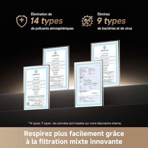 Protégez votre famille des polluants: Le purificateur capture les COVT et jusqu’à 14 types de polluants atmosphériques tels que les acariens ou le pollen, réduisant ainsi les risques respiratoires et les symptômes d’allergies