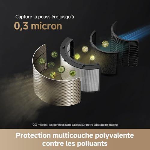 Une filtration multicouche contre les particules: Profitez d’une grande efficacité de filtration grâce au système multicouche qui retient efficacement les allergènes et les minuscules particules de 0,3 micron; La lampe UVC et la libération d’ions stables éliminent les odeurs pour une respiration sûre et saine