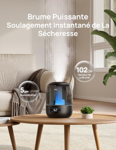 Spécification: Dreo 3L humidificateur d’air bébé Silencieux 26dB, Ultrasonique Brume Fraîche, Buse 360°, 30H Autonomie, Diffuseur d’Huiles Essentielles, Lumière Ambiance, pour Maison, Plantes, Noir