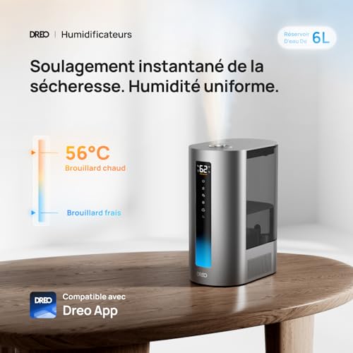 Dreo 6L Humidificateur chambre à coucher, intelligent, brume chaude/froide, pour plantes et bébé, remplissage par le haut, 60H d’autonomie, silencieux, avec minuterie, compatible Google/Alexa, HM713S