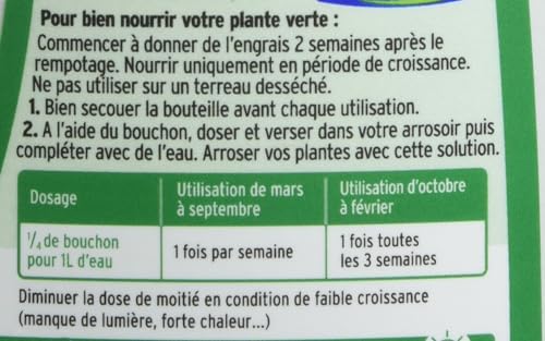 BIEN DOSER VOTRE ENGRAIS : De mars à septembre : 1/4 de bouchon pour 1L d’eau une fois par semaine. D’octobre à février : 1/4 de bouchon pour 1L d’eau une fois toutes les 3 semaines. Diminuer la dose de moitié en condition de faible croissance (manque de lumière, chaleur …). Pour des plantes encore plus vertes, bien nettoyer les feuilles pour favoriser la photosynthèse.