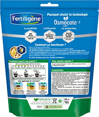 Spécification: FERTILIGENE OSPPBN – Dés d’Engrais Longue Durée Osmocote Max Plantes Vertes et Fleuries x25 – Pratique, 1 seule application par an – Protège les racines – Résultats dès 1semaine – Pour 25 plantes