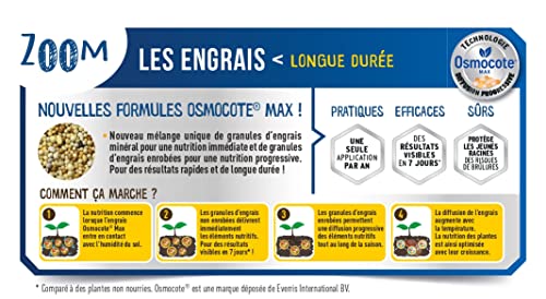 UN ENGRAIS LONGUES DUREE ! L’Osmocote Max est un mélange unique à base d’engrais à libération immédiate pour une action rapide. De granules enrobées à libération progressive pour une action longue durée. La résine protectrice qui recouvre l’engrais permet une diffusion continue des élements nutritifs selon les besoins de la plante. 1 seule application, la plante est nourrie pendant 1 an !
