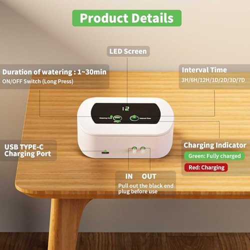【Largement Utilisé】Le système d’irrigation goutte-à-goutte automatique utilise un port de charge USB-C, offrant plus de commodité et de compatibilité. Vous pouvez placer ce système d’irrigation goutte à goutte à l’intérieur, sur le balcon, dans la serre, etc. et profiter du plaisir de l’arrosage automatique. (Remarque : veuillez ne pas le placer à l’air libre !)