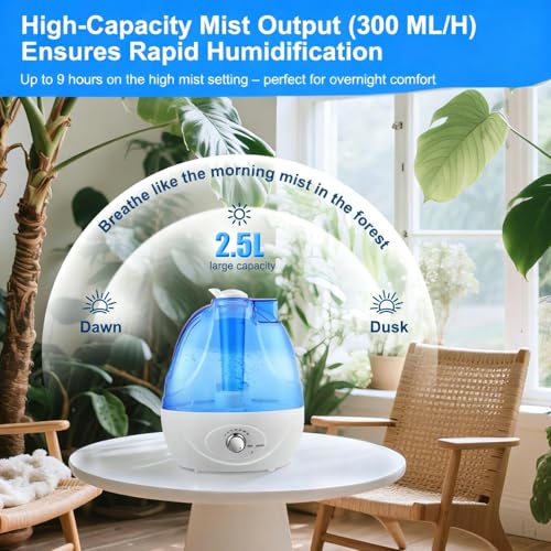 Humidificateur d’air Bébé 2,5L, Humidificateur d’air Chambre avec LED, Grande Brume 300 ml/h, 28 dB Ultrasons Silencieux, Rotation à 360 °, Humidificateurs pour Chambre Bureau, Enfants et Plantes