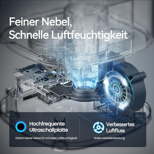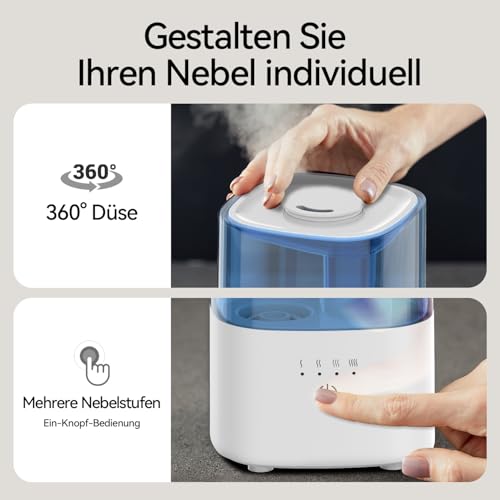 PERSONNALISEZ VOTRE BROUILLARD : Vous pouvez régler l’intensité de la brume d’un simple toucher pour atteindre le niveau d’humidité idéal et assurer un confort optimal. La buse peut être tournée manuellement à 360°, permettant à la brume d’être diffusée dans la direction souhaitée.
