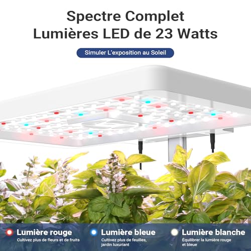 Kit de Jardin Réglable en Hauteur: La hauteur de la partie lumineuse du système de culture hydroponique peut être ajustée selon les besoins, jusqu’à 11,02 pouces, pour s’adapter à la hauteur des plantes aux différents stades de croissance