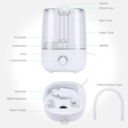 Facile à Utiliser: L’humidificateur est doté d’un design de remplissage par le haut pour une injection pratique de l’eau et d’une fonction d’utilisation à bouton unique. En tournant le bouton, vous pouvez allumer/éteindre l’humidificateur et régler la quantité de brume en cours de fonctionnement.