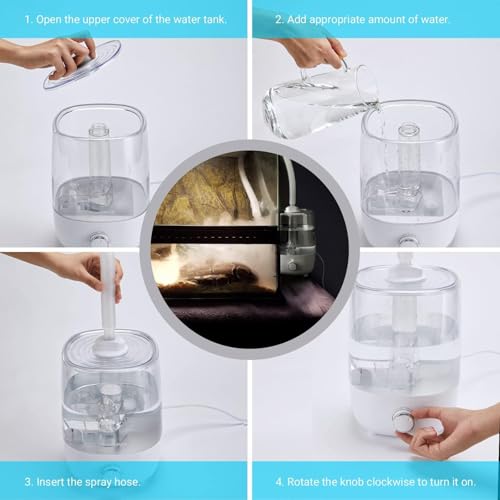 Grand Réservoir d’eau: Cet humidificateur reptile à remplissage par le haut est équipé d’un réservoir d’eau de 4 litres, ce qui lui permet de fonctionner en continu pendant 12 heures. Il peut vous aider à créer un environnement suffisamment humide pour vos animaux de compagnie.