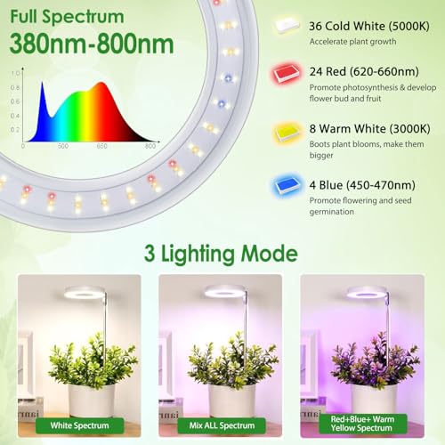 Eclairage à Spectre Complet: La lampe de culture de plantes comprend 72 perles LED qui émettent une combinaison de lumières blanches(36pcs), rouges(24pcs), bleues(4pcs) et jaune chaude(8pcs). Elle émet toutes les longueurs d’onde de 380nm à 800nm. Cet éclairage à spectre complet peut répondre aux différentes exigences d’éclairage des plantes à différents stades de croissance, favorisant une croissance saine et augmentant le rendement des plantes.