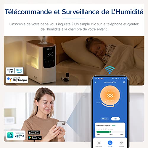 【Télécommande intelligente】Pour vous apporter une vie plus intelligente, vous pouvez utiliser VeSync gratuitement pour surveiller et gérer votre OasisMist intelligent ! Tu vas rentrer chez toi ? Vous pouvez allumer l’humidificateur à l’avance et profiter de la meilleure humidité possible à la maison !
