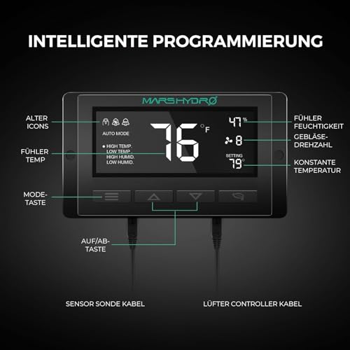 Aérotation et circulation automatiques : le système de ventilation est équipé d’une sonde intelligente qui peut détecter avec précision la température et l’humidité dans la tente. Lorsque vous réglez la température et l’humidité nécessaires à l’aide du contrôleur numérique intelligent, le système d’aération est automatiquement ventilé pour régler la température et l’humidité dans la tente.