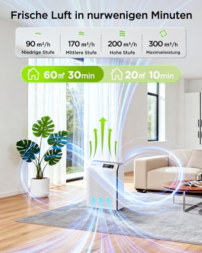 【Purificateur d’air Ganymede: débit de 20m³/h, jusqu’à 15 renouvellements d’air par Heure】Ce purificateur d’air atteint un débit d’air purifié (CADR) maximal de 300m³/h. Mode Turbo : débit de 20m³/h, jusqu’à 15 renouvellements d’air. Mode Élevé : CADR : 200m³/h, débit de 20m³/h, jusqu’à 10 renouvellements d’air. Mode Moyen : débit de 170m³/h, débit de 20m³/h, jusqu’à 8-9 renouvellements d’air. Mode Veille/Mode Bas : CADR : 90m³/h, débit de 20m³/h, jusqu’à 5 renouvellements d’air par heure.