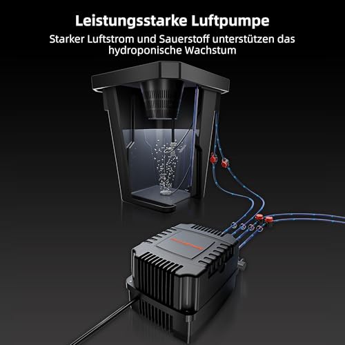 【EINSTELLBARE LEISTUNGSSTARKE LUFTPUMPE】Leistung: 15 Watt, leistungsstarker Luftstrom, maximaler Luftstrom: 27L/min. In Verbindung mit einem Luftstein kann der Luftstein das Wurzelsystem der Pflanze effektiv mit ausreichend Sauerstoff versorgen und ihr so zu einem kräftigen und gesunden Wachstum verhelfen.