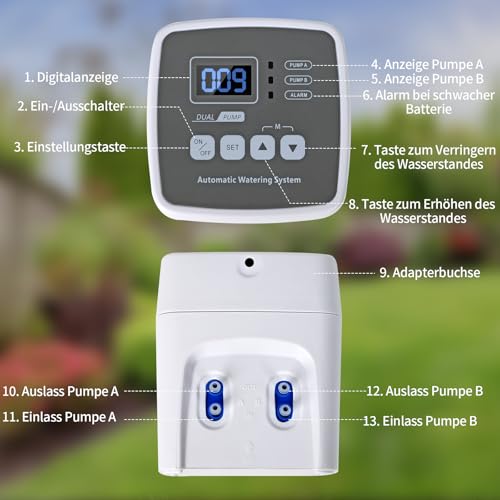 💦【Système d’irrigation de contrôle】Ce système arrosage automatique peut contrôler la pompe A et la pompe B séparément et régler le temps d’irrigation : 0 s à 999 s, temps d’intervalle : 0 à 999 h. Contrôlez la fréquence et la durée des arrosages. Idéal pour une utilisation quotidienne, des vacances ou des voyages d’affaires – vos plantes sont ainsi toujours arrosées de manière optimale. Économisez de l’eau et profitez d’un entretien intelligent des plantes par rapport aux systèmes d’irrigation conventionnels. Idéal pour l’arrosage intérieur !