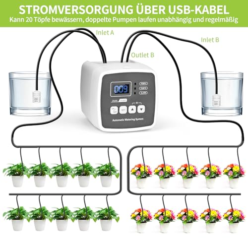 Ambesty Système D’arrosage Automatique, Kit D’irrigation avec 20 pointes de goutte à goutte,Arrosage automatique avec 2 pompe à contrôle indépendant avec 15M Tuyau rechargeable pour Jardin, Balcon, pour jusqu’à 20 plantes en pot