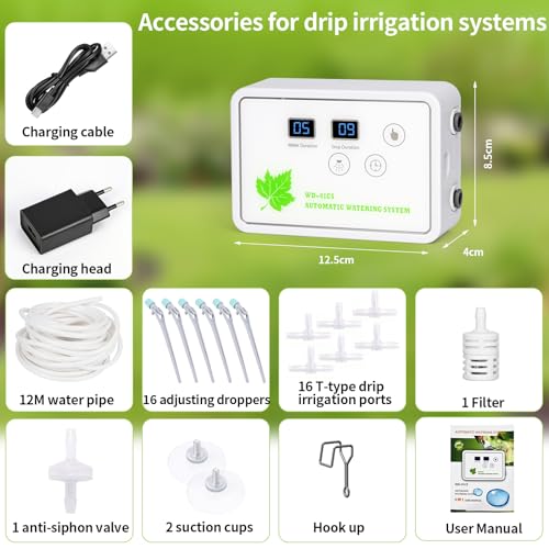 🔌 Alimentation USB-C – Fiable et économe en énergie. Ce système d’arrosage automatique est alimenté exclusivement par câble USB-C. Pas besoin de changer les piles – il suffit de le brancher sur une banque d’alimentation, un adaptateur ou une prise électrique pour profiter d’un arrosage sans interruption.