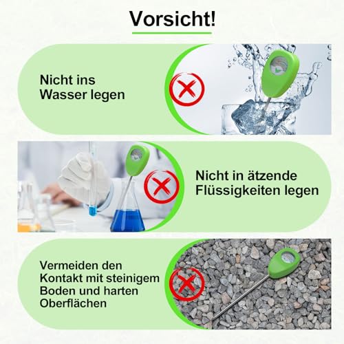 Ce testeur est conçu pour les sols classiques. Ne pas l’utiliser dans du sable, de la sciure ou des substrats très secs et durs. Ne pas le laisser enfoncé dans le sol en permanence. Nettoyer et sécher après chaque usage.