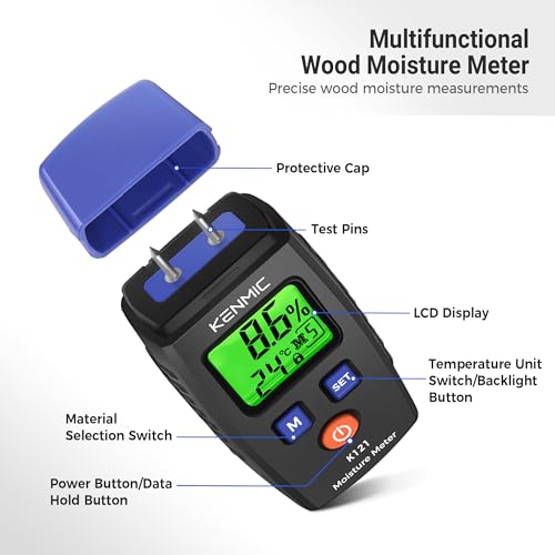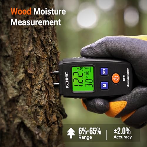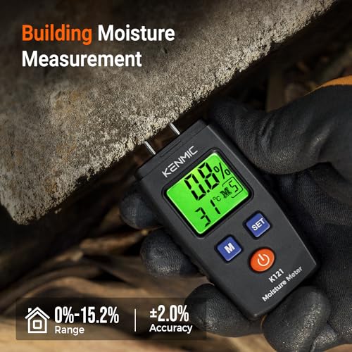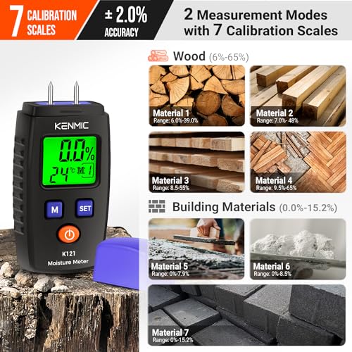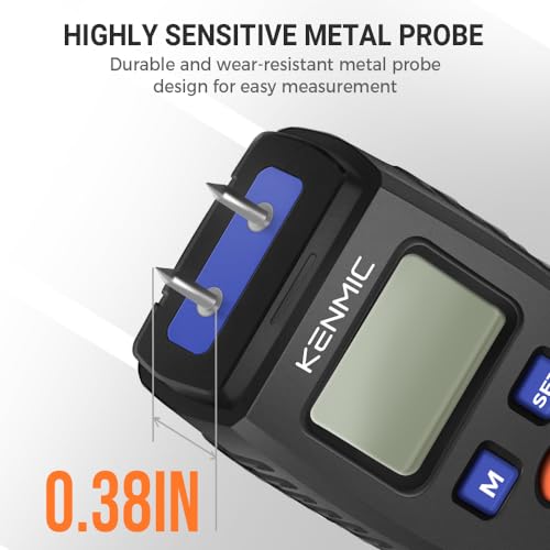 MESURE PRÉCISE DE L’HUMIDITÉ: Le testeur d’humidité KENMIC offre une précision fiable de ±2,0 %, avec deux modes dédiés pour le bois et les matériaux de construction. Équipé de 7 modes préconfigurées et de deux sondes métalliques sensibles, il fournit des résultats précis sur bois de chauffage, plaques de plâtre, briques et plus encore.