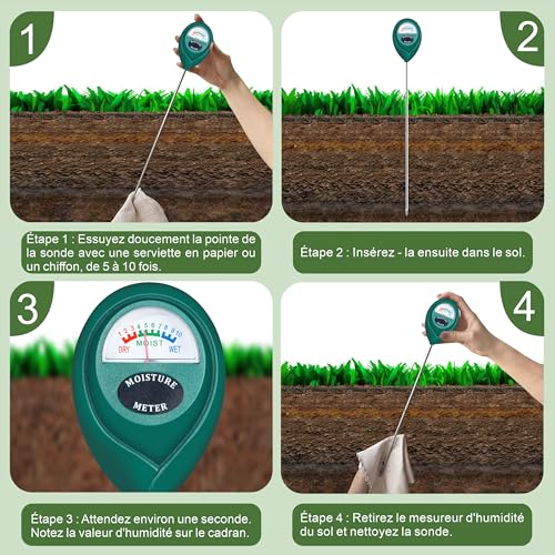Lecture immédiate de l’humidité : insérez la sonde dans le sol, et sans attendre, le cadran affichera immédiatement le niveau d’humidité. Vous pouvez ensuite décider si votre plante a besoin d’arrosage en fonction de la mesure. Ne laissez pas cet humidimètre dans le sol pendant plus de 5 minutes, car la pointe métallique se corrode progressivement.